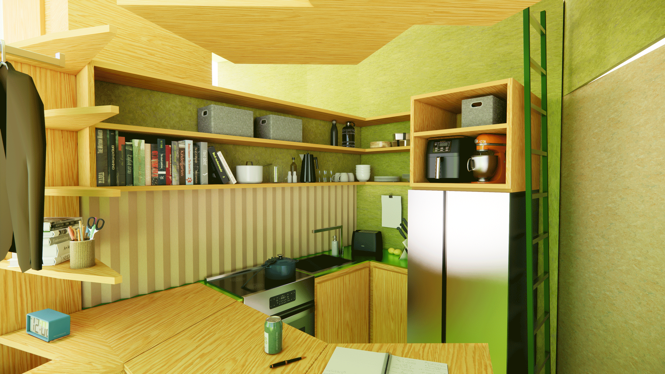MATERIALS: Many of the vertical surfaces and operable partitions are finished with acoustic materials like tectum to reduce noise and to allow inhabitants opportunities to customize their spaces by pinning posters and photos up. To indicate operability, the acoustic material of all of the operable partitions are in one colorway, while the fixed partitions are another (orange and green, respectively, in the drawings and renders). To keep this housing project more affordable, many of the horizontal surfaces are constructed of cost-effective plywood with the grain visible and used directionally to indicate spatial distinctions. Handles on operable partitions and stair railings—anything that you would hold onto—are visually coded as green steel casings backlit by light stripping under or behind the long steel handles.